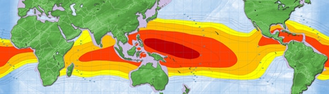 Поверхностные воды океана - гигантский “аккумулятор солнечных лучей”. Причем в отличии от других возобновляемых источников он доступен 24 часа в сутки. На карте обозначены зоны, где имеет смысл установка систем типа ОТЕС.