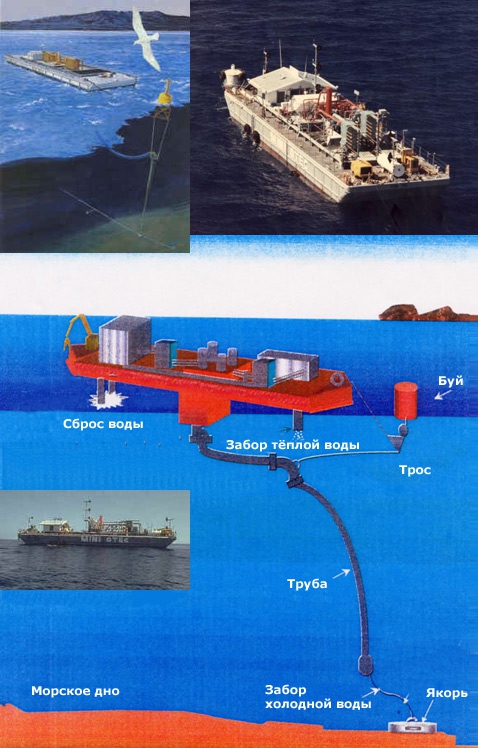 Таким системам было дано название “системы конверсии тепловой энергии океана” (Ocean Thermal Energy Conversion - OTEC). Принцип который был описан носит название “ОТЕС с закрытым циклом”. Еще есть “с открытым циклом”. В отличии от закрытого, в открытом цикле рабочей жидкостью является сама морская вода, которая закипает в закрытом сосуде с давлением ниже атмосферного, а также конденсируется при помощи глубинной морской воды, превращаясь в питьевую.