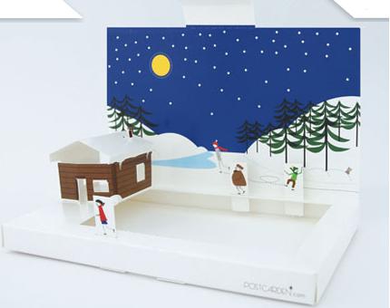 Открытка размером 155х18х95 мм превращается в бревенчатый дом на фоне зимнего пейзажа и звездного неба: напротив домика расположен открытый каток, а фоном играет приятная праздничная мелодия…